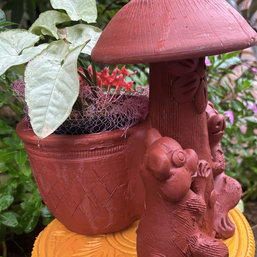 Add a whimsical woodland touch to your home or garden with our Handmade Terracotta Mushroom Planter. Expertly crafted by skilled artisans, this unique planter features a detailed mushroom centerpiece hugged by a charming Pigs making it both a functional plant holder and a delightful decorative piece.