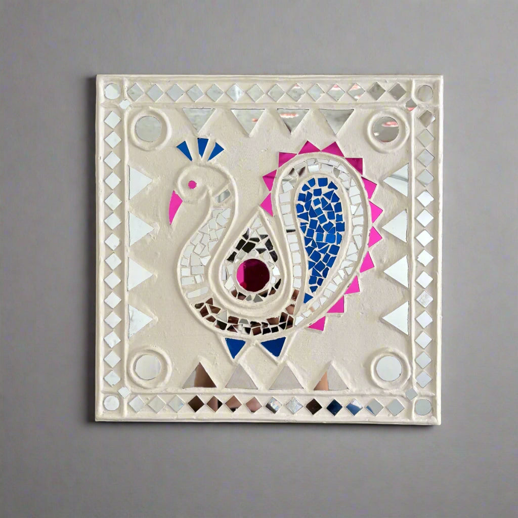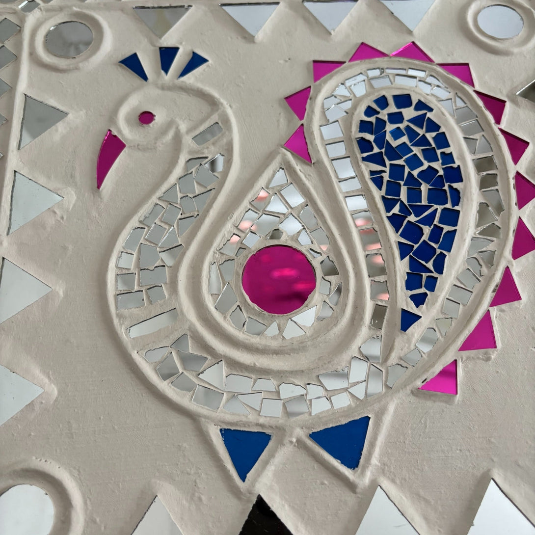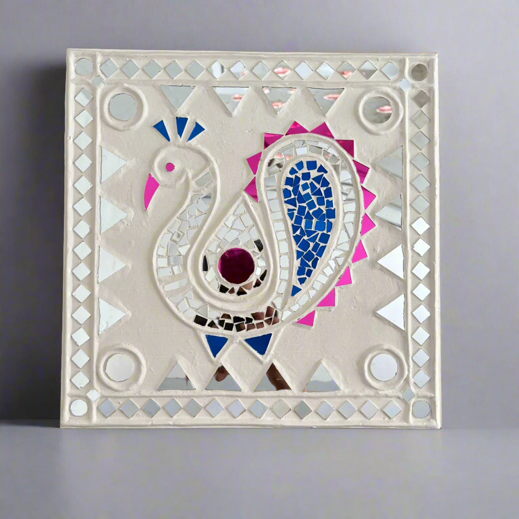 Peacock - Mud & Mirror art frame! This traditional craft of Mud & Mirror work is from Kutch and is made with authentic materials and processes. The peacock is a widely used motif in embroidery, painting, tattoos, jewelry, and mud mirror work. This frame is embellished with blue and fuchsia colored glass, making it an amazing piece to have on your wall.