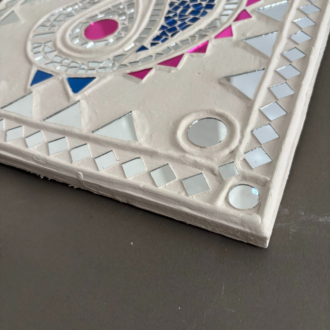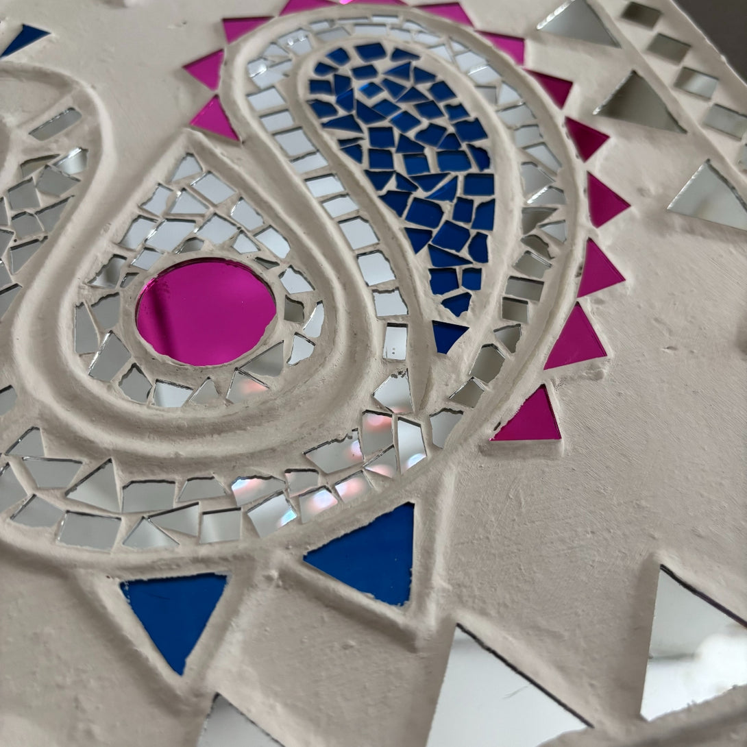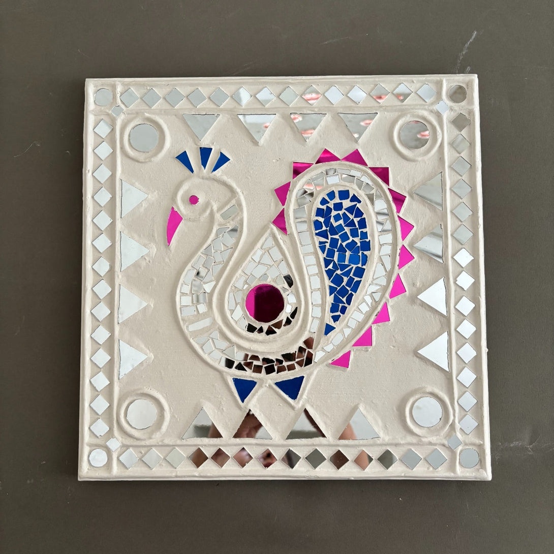 Peacock - Mud & Mirror art frame! This traditional craft of Mud & Mirror work is from Kutch and is made with authentic materials and processes. The peacock is a widely used motif in embroidery, painting, tattoos, jewelry, and mud mirror work. This frame is embellished with blue and fuchsia colored glass, making it an amazing piece to have on your wall.