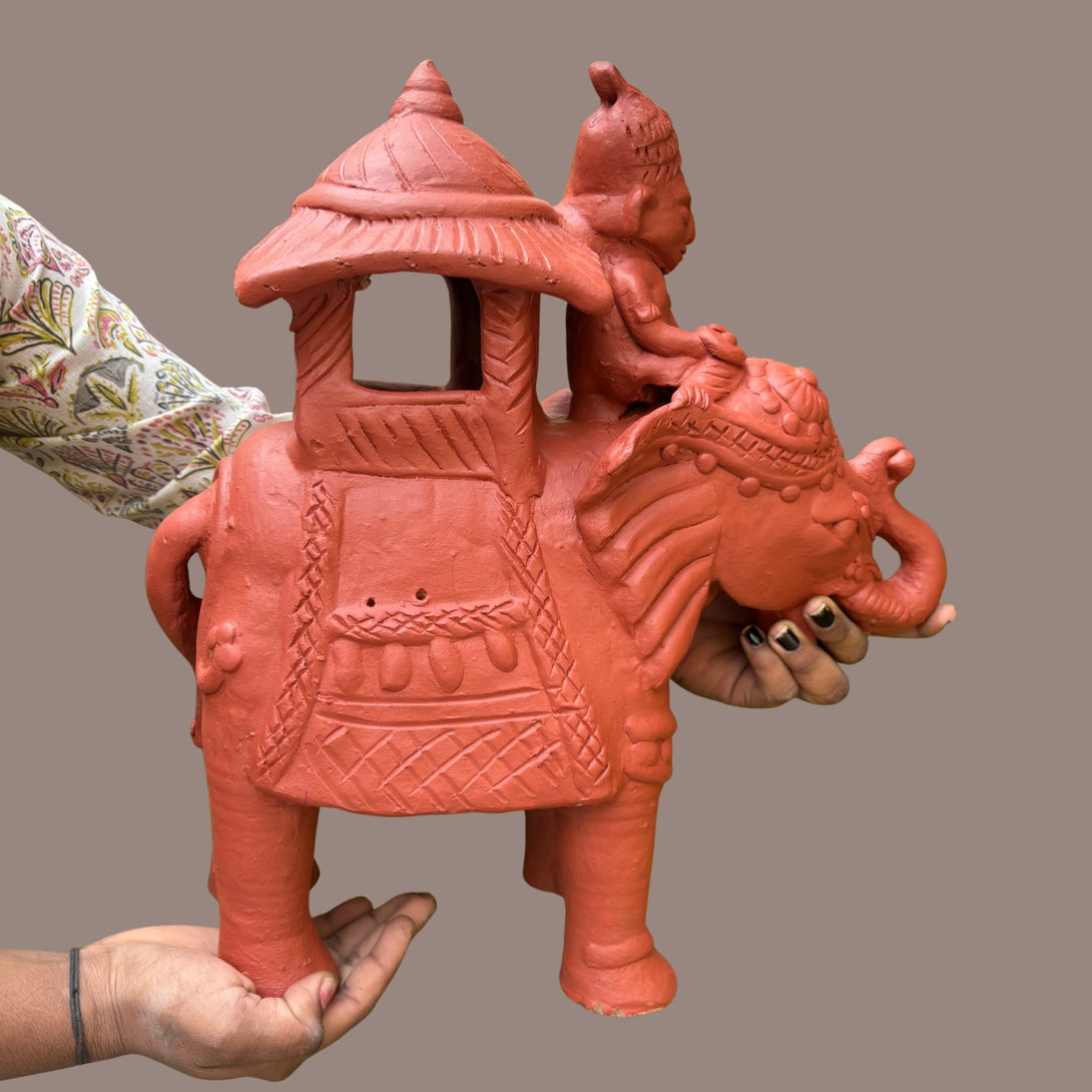 Bring home a touch of timeless Indian craftsmanship with this Majestic Terracotta Elephant Rider Figurine. Hand-sculpted by skilled rural artisans, this piece beautifully depicts an elephant adorned with traditional carvings, carrying a royal rider.