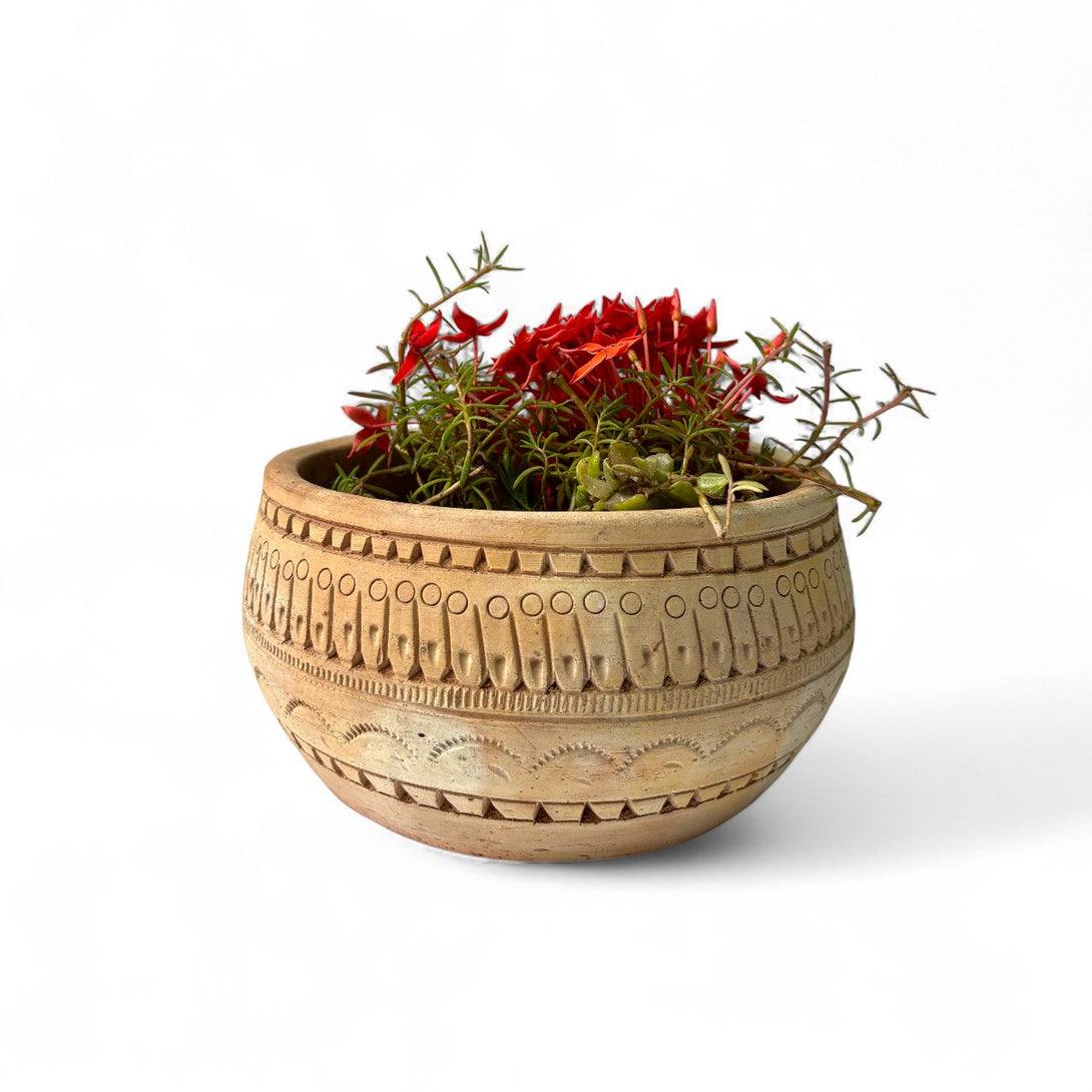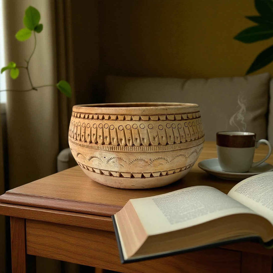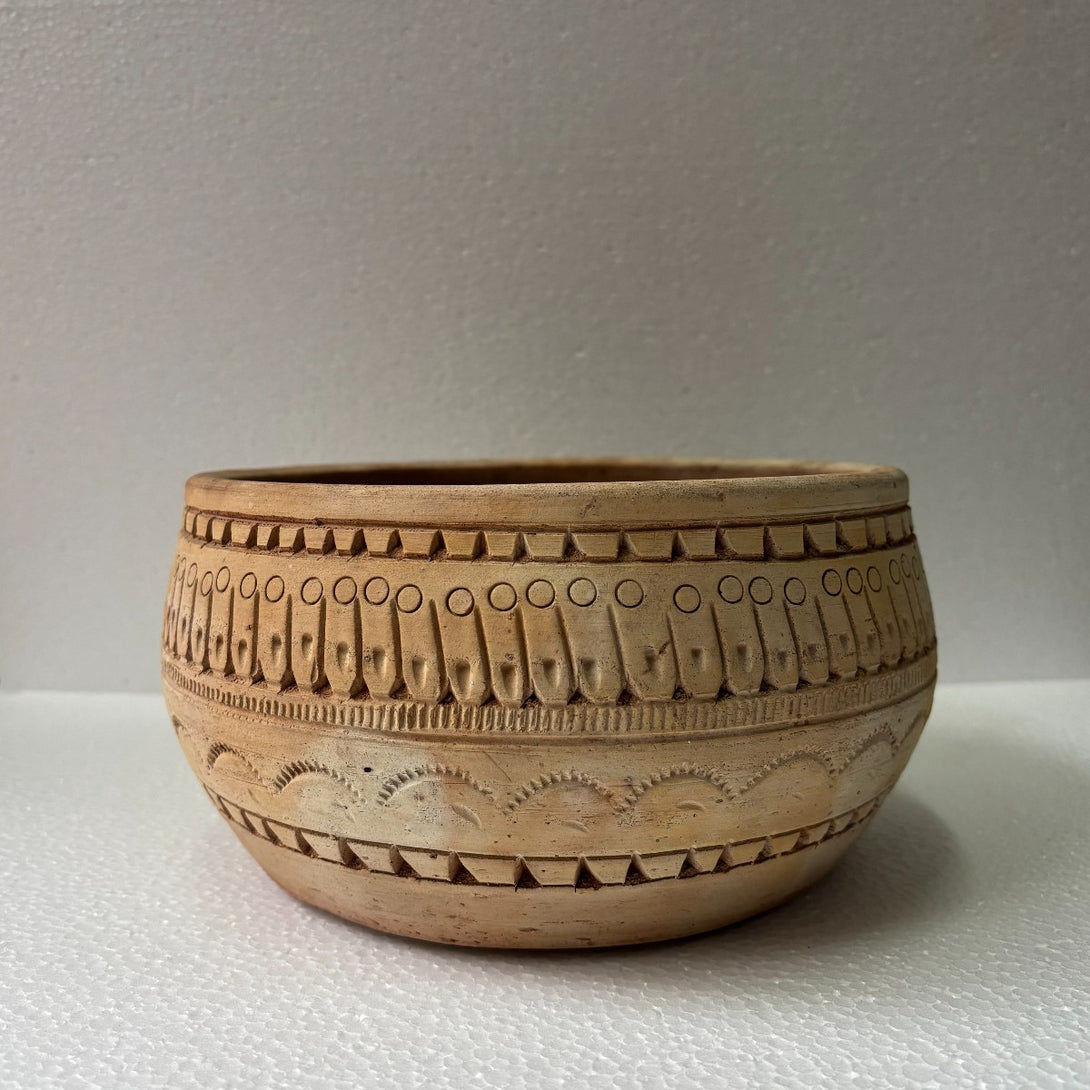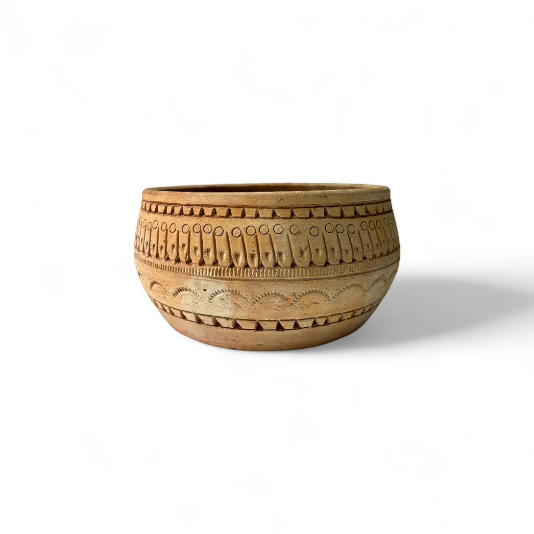 Add timeless charm to your home with our Rustic Terracotta Pot, beautifully handcrafted by Indian skilled artisans. Made from natural clay, this earthy pot features intricate hand-carved detailing with geometric and wave-inspired patterns that celebrate traditional craftsmanship.