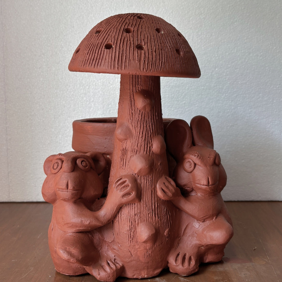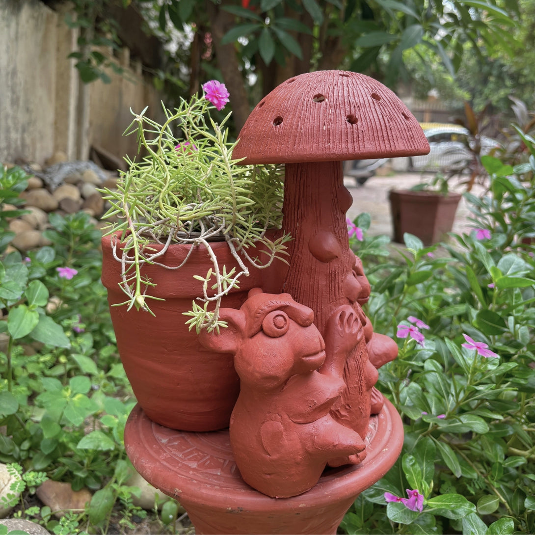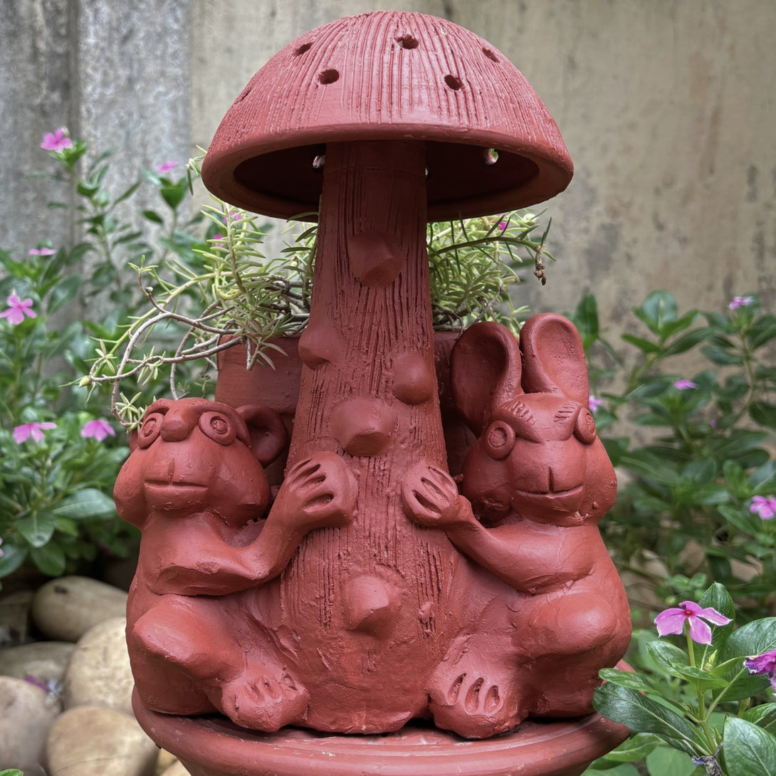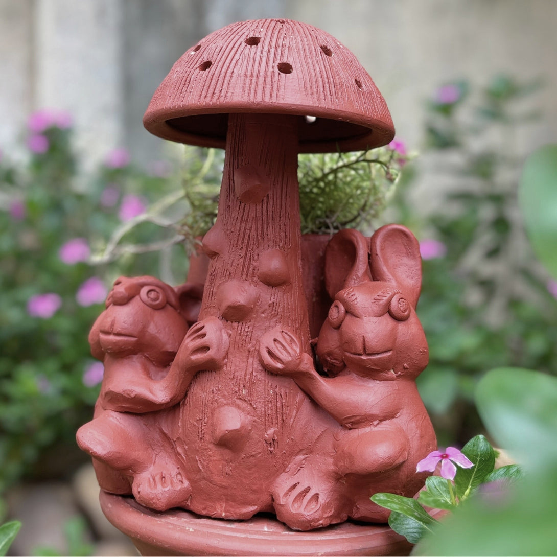 Terracotta Mushroom Planter with Frog & Rabbit Design Rustic Indoor & Outdoor Decor