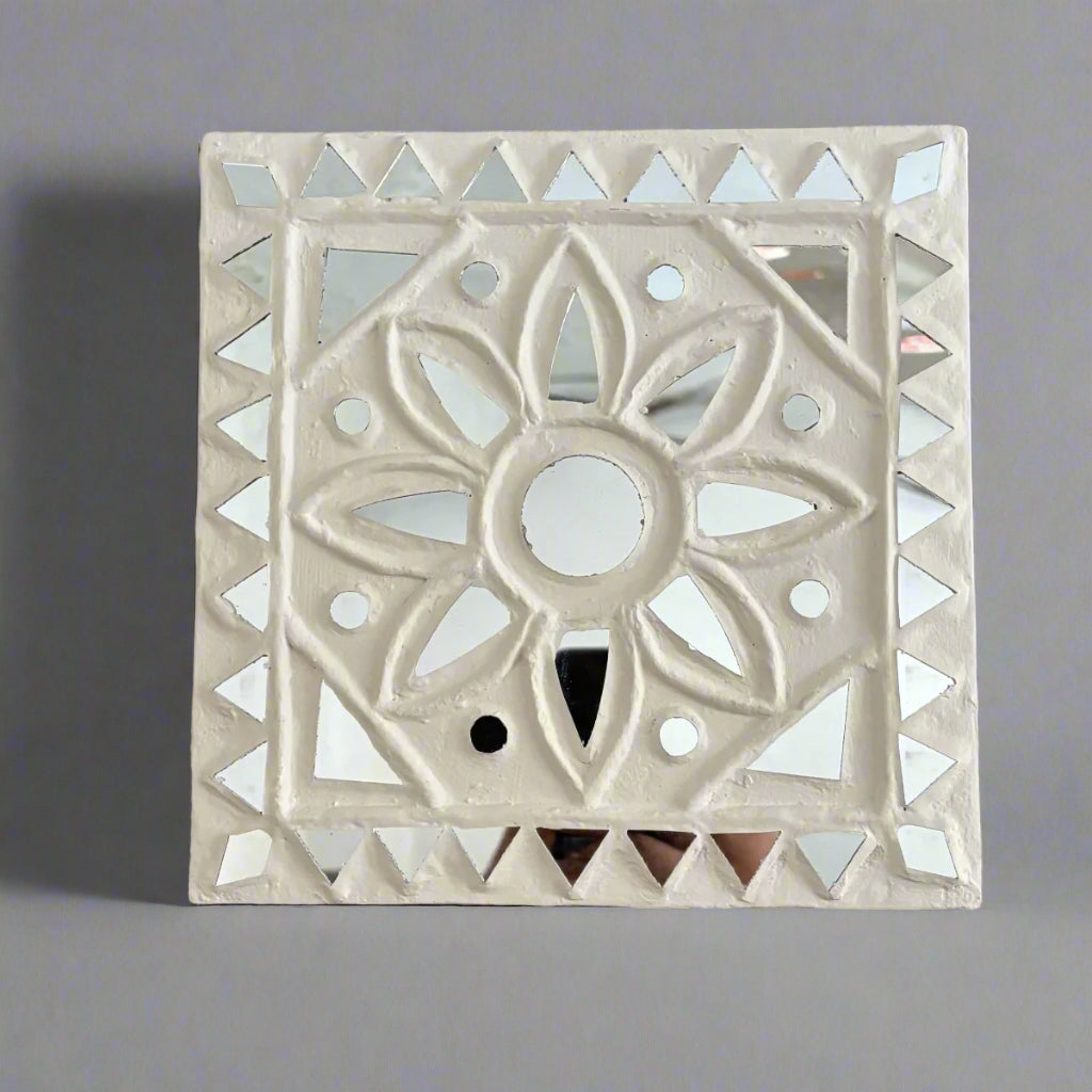 Bring home the charm of Kutch craftsmanship with this Traditional Lippan Art Panel. Handcrafted using the age-old technique of mud and mirror work, this 8" x 8" wall panel features a beautifully detailed Floral motif, symbolizing joy and vibrance. The intricate design reflects light through delicate mirror inlays, adding a rustic yet elegant touch to your décor.