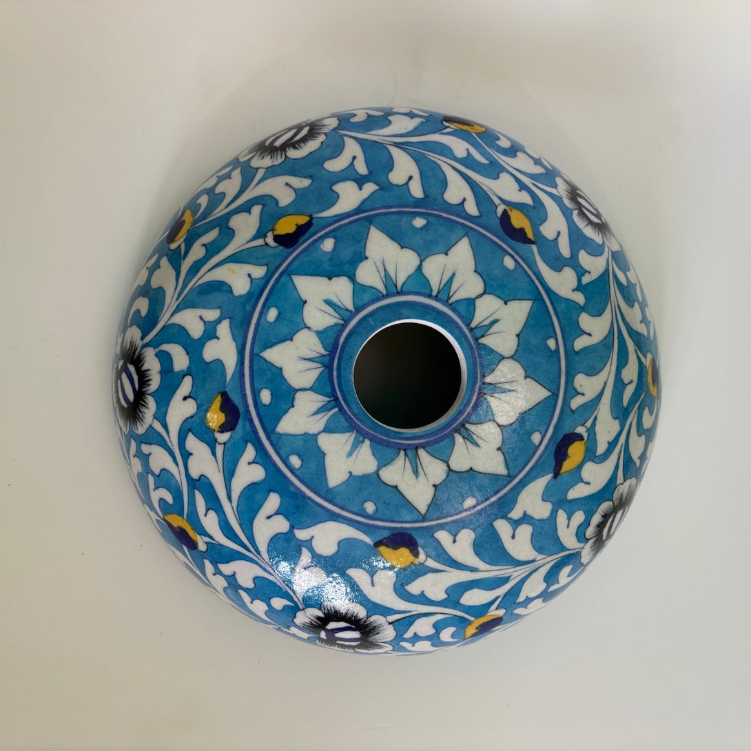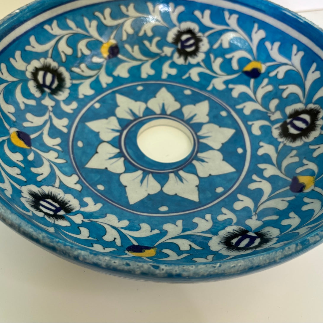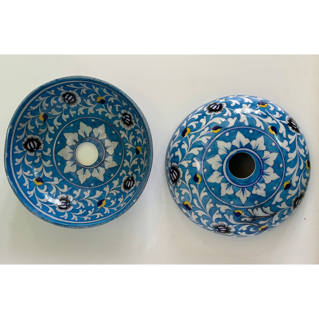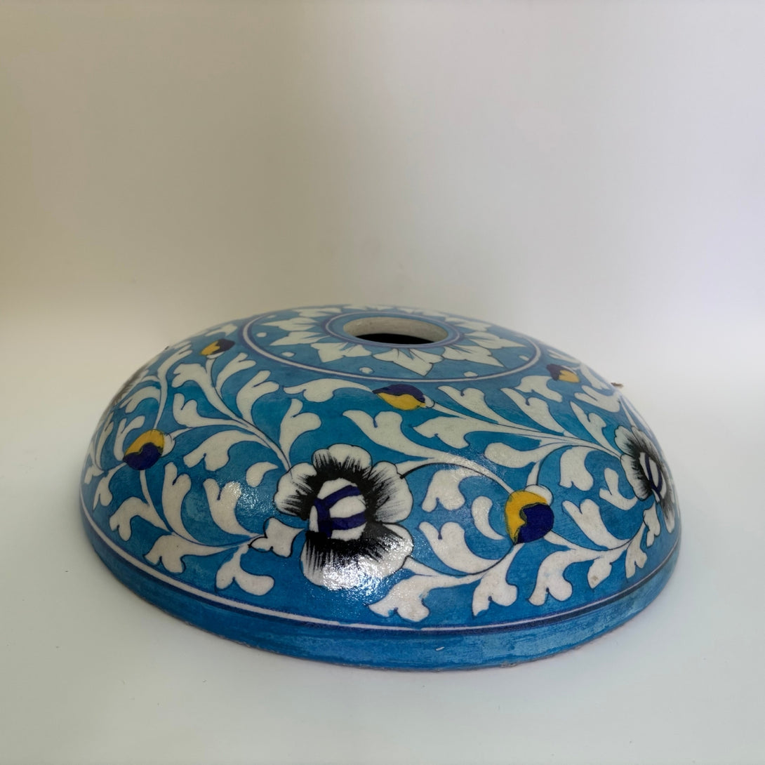 This hand-painted turquoise blue pottery lamp shade showcases delicate floral motifs that reflect the timeless craft of Jaipur’s pottery tradition.
