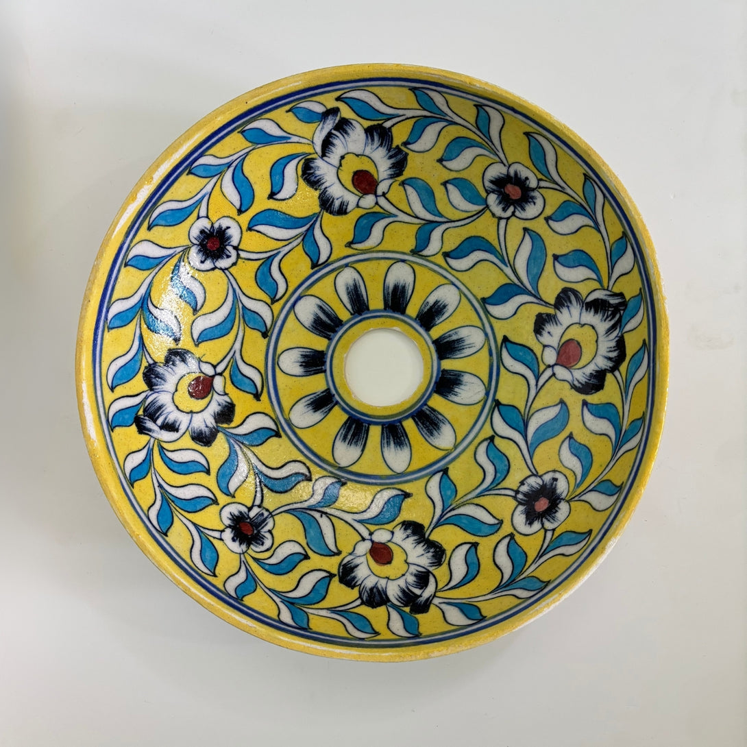 Measuring 10” in diameter x 3” in height, it comes with fixtures included and carries the timeless artistry of Jaipur’s blue pottery tradition.