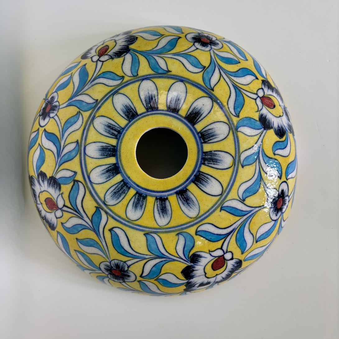 Bright, bold, and beautifully hand-painted, this yellow floral blue pottery lamp shade adds a burst of color to any space.